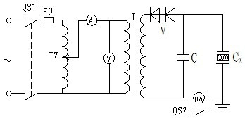 直流耐壓及泄漏電流試驗(yàn)設(shè)備,一般由調(diào)壓器、試驗(yàn)變壓器、半導(dǎo)體硅堆組成的半波整流電路和測量儀表構(gòu)成,試驗(yàn)接線如圖1-4所示。